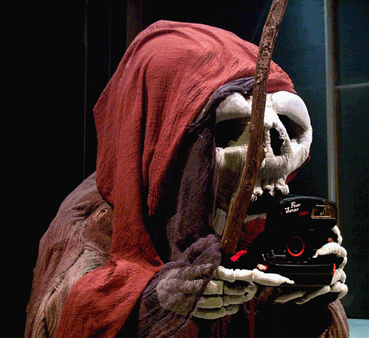 Black Death, as a tourist in Europe, takes instant photos of his victims everywhere he goes. All real logos on the camera were removed and replaced with the "Fear Saver" logo.