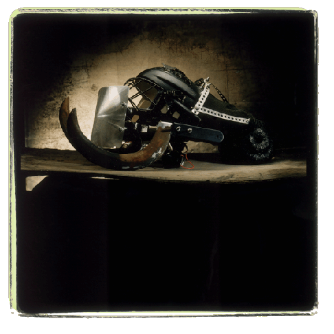 <-- The headpiece for the costume was built on a hockey goalie's helmet. The helmet was wired with its own lamps so that the wearer's face would always be illuminated. A curved fresnel lens in front distorts the wearer's face.
