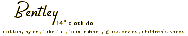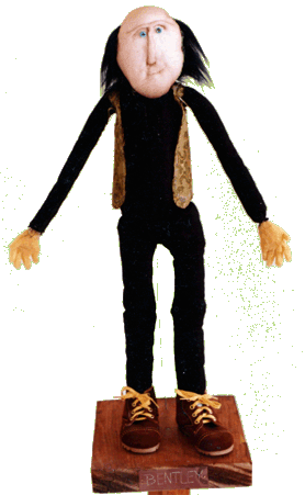I had made a lot of nylon stocking Christmas tree ornaments in 1980, and Bentley's head was actually a leftover from that project -- too big for the tree. After I finished the Superklutz doll I decided to use the extra head for a new doll in the series, and thus Bentley. His vest is made from some scrap of old curtain I found around the house, and his shoes came from the children's department at the local K-Mart. (Several subsequent dolls were similarly outfitted.) I put wires inside his foam rubber hands so that the fingers would be poseable. |