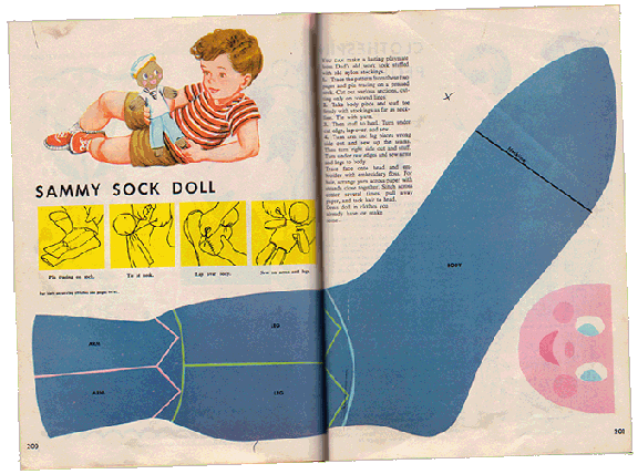 It contains dozens and dozens of easy projects using common household junk. It teaches basic cooking, needlework, woodworking, drafting, and craft techniques with optimism and innocence. I made my own Sammy Sock Doll following the directions from this book. He was, as the book's editors promised, a lasting playmate. At least until the dog got him. |