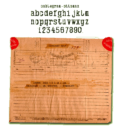 <-- This font is based on a coded Turkish telegram from 1913. It is a monospaced all-lowercase alphabet.