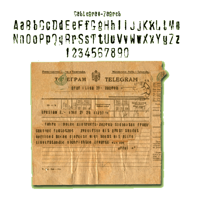 This font is based on two different telegrams: the uppercase alphabet is from an Algerian telegram from 1903, and the lowercase is from a Yugoslavian telegram from 1915.