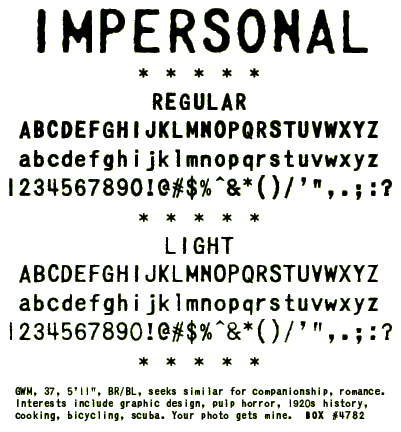 This monospaced typewriter font is a detailed replica of letters appearing in La Plume, a 1950s personal ads magazine. The magazine billed itself as "The correspondence medium devoted to the connoisseur of the ‘unusual’."